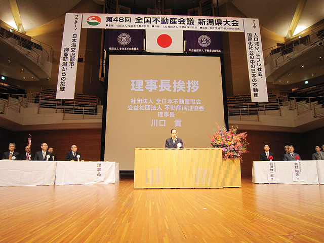 | 本大会で48回目開催を迎えます「全国不動産会議」は、全国の全日会員が一堂に会し、新潟県本部が中心となり新潟市内の施設で開催されました。講演、シンポジウム、交流会等、充実した内容で行われ、たいへん有意義な会合となりました。当日の新潟県地方はあいにくの暴風雨の悪天候でしたが、支部からは代表して役員7名が出席致しました。 尚、次の年度の全国会議は、鹿児島県で開催予定です。 |