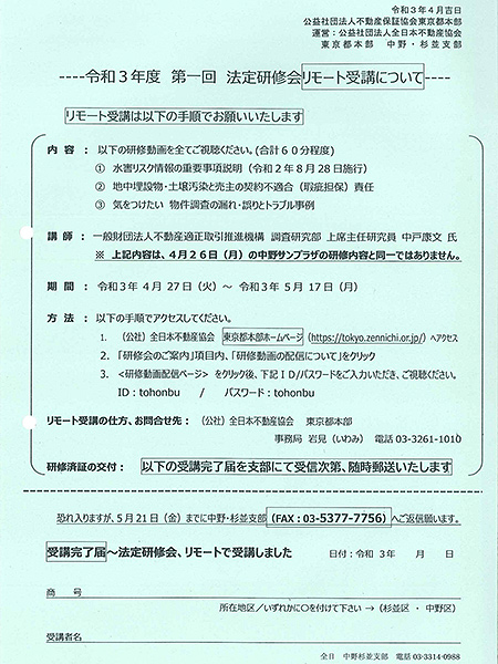 令和3年度の第一回目の法定研修会は実務に即した内容で企画され、受講については新型コロナ感染症対策として、対面受講かリモート受講のいずれかを選択して頂きました
