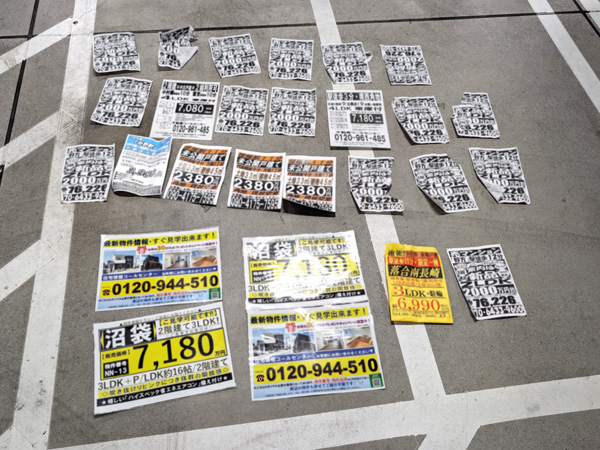 当日は齊藤委員長を中心に井上支部長を含む車2台、計5名の委員が業務にあたり、27枚の違法広告物を除却、中野区の担当者へ報告と引き渡しを行いました。